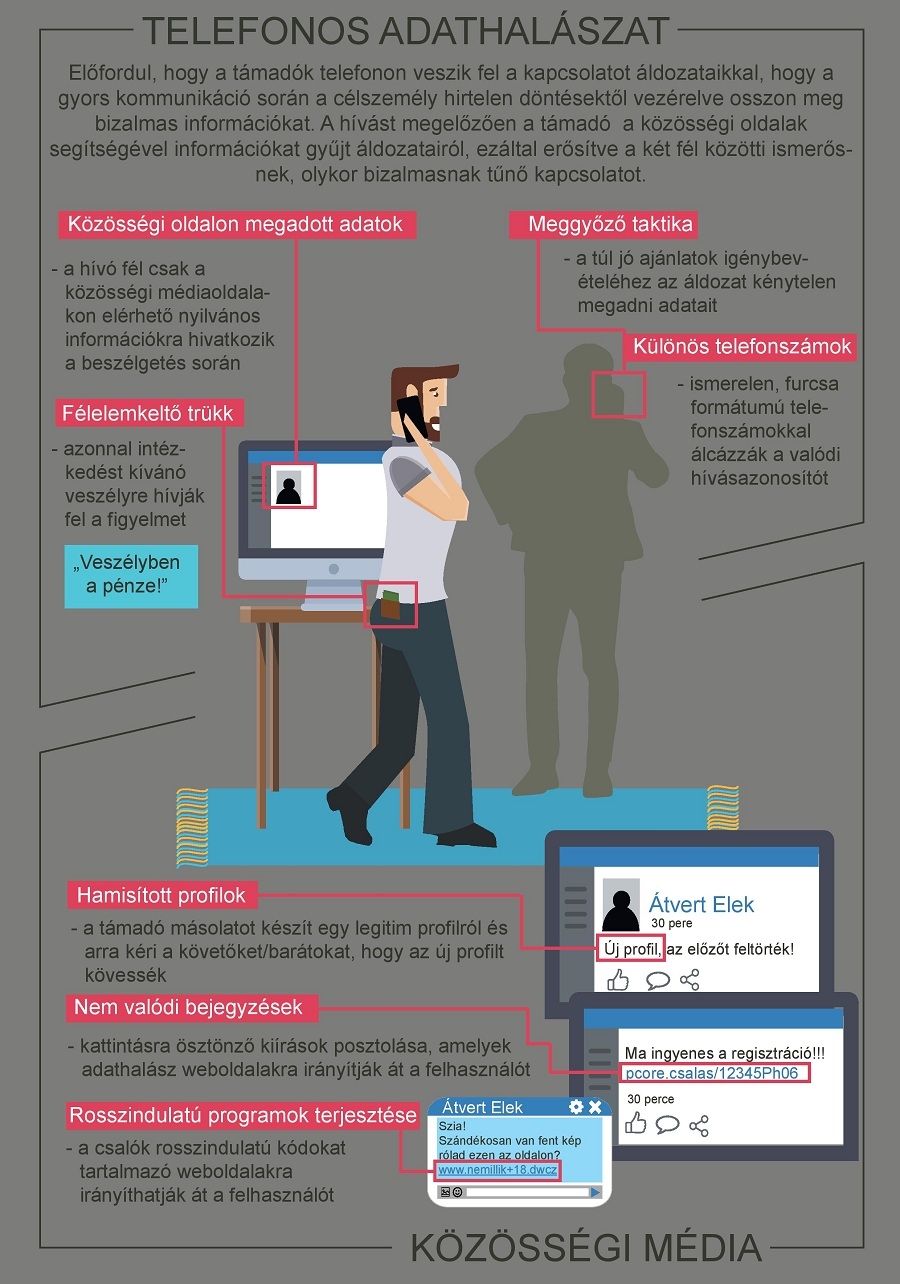 Az elkövetési mód lényege, hogy a támadók telefonon, e-mailben vagy egy közösségi oldalon keresztül megtévesztik a kiszemelt áldozatokat, és megpróbálják rávenni őket arra, hogy saját maguk adják meg adataikat az illetékteleneknek, vagy önszántukból utaljanak át nekik pénzt.