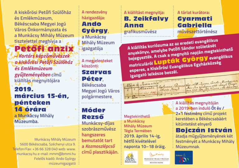 Nemzeti ünnepünkön 14.00-kor veszi kezdetét a Petőfi anzix – Kortárs képzőművészek a kiskőrösi Petőfi Szülőház és Emlékmúzeum gyűjteményében című időszaki kiállítás megnyitó rendezvénye a Tégla Teremben. A tárlatot a kiskőrösi Petőfi Szülőház és Emlékmúzeummal együttműködve 2019. április 14-ig mutatja be az intézmény.
