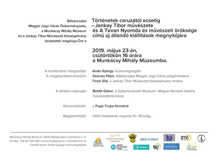 Hamarosan megnyitja kapuit a Jankay-Kolozsváry-Tevan Gyűjtemény új állandó kiállítása. A Munkácsy Mihály Múzeum 2019. május 23-án, csütörtökön 16 órai kezdettel nyitja meg a Történetek ceruzától ecsetig – Jankay Tibor művészete és A Tevan nyomda és művészeti öröksége című új állandó kiállításait. Az ünnepélyes megnyitóra szeretettel várunk minden érdeklődőt!