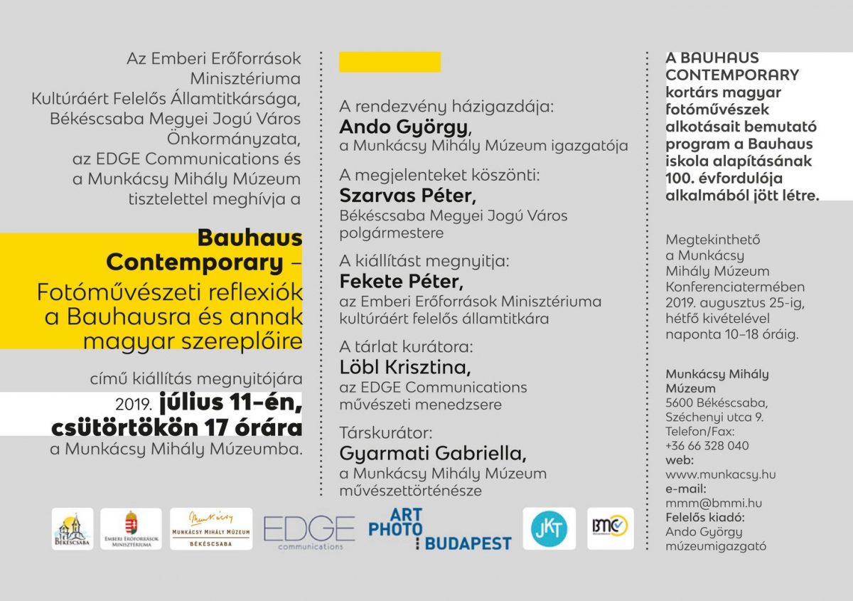 A Bauhaus Contemporary – Fotóművészeti reflexiók a Bauhausra és annak magyar szereplőire című kiállítás a Bauhaus által létrehozott új univerzum, vizuális és oktatási rendszer korunkra, pontosabban a kortárs magyar fotográfiára gyakorolt hatását vizsgálja. A Bauhaus most kiindulási pont. A Bauhaus most inspiráció. A Bauhaus most ihlet. A Bauhaus most egy kérdésfelvetés, amelyre 15 (!) magyar fotográfus ad XXI. századi választ.