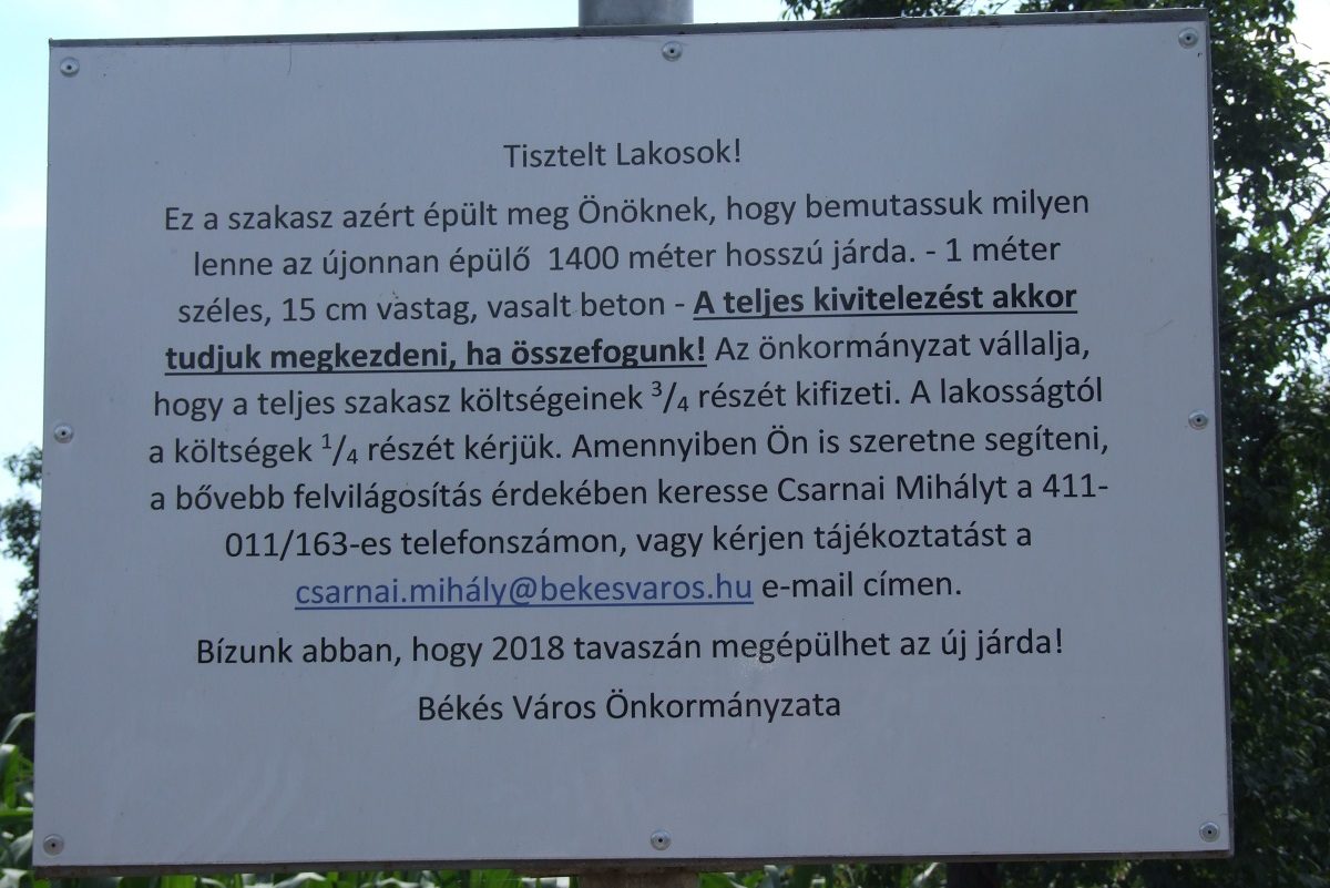 Elindult az igényfelmérés, online felhívás és nyomtatott szórólap formájában kereste fel az önkormányzat az ott élőket. Mezőőrök bevonásával mérte fel az önkormányzat, hogy hány háztartást is érint személy szerint a fenti probléma. Összegyűltek a felajánlók és elindulhatott a munka. 2019 tavaszára tervezték az átadást, ami végül kicsit ugyan elhúzódva, de a közelmúltban megtörténhetett. A járdát a lakosság, az önkormányzat, a BKSZ, valamint a közmunkások összefogásával sikerült felújítani.