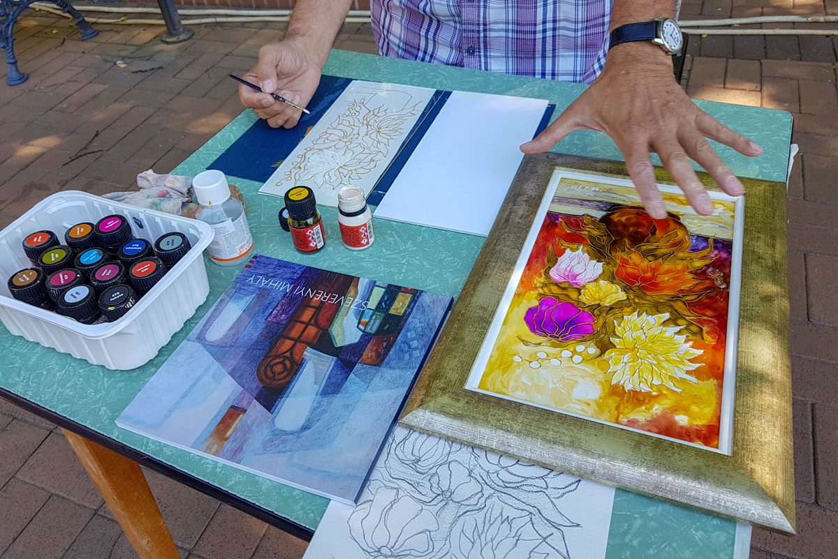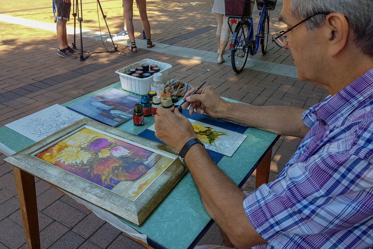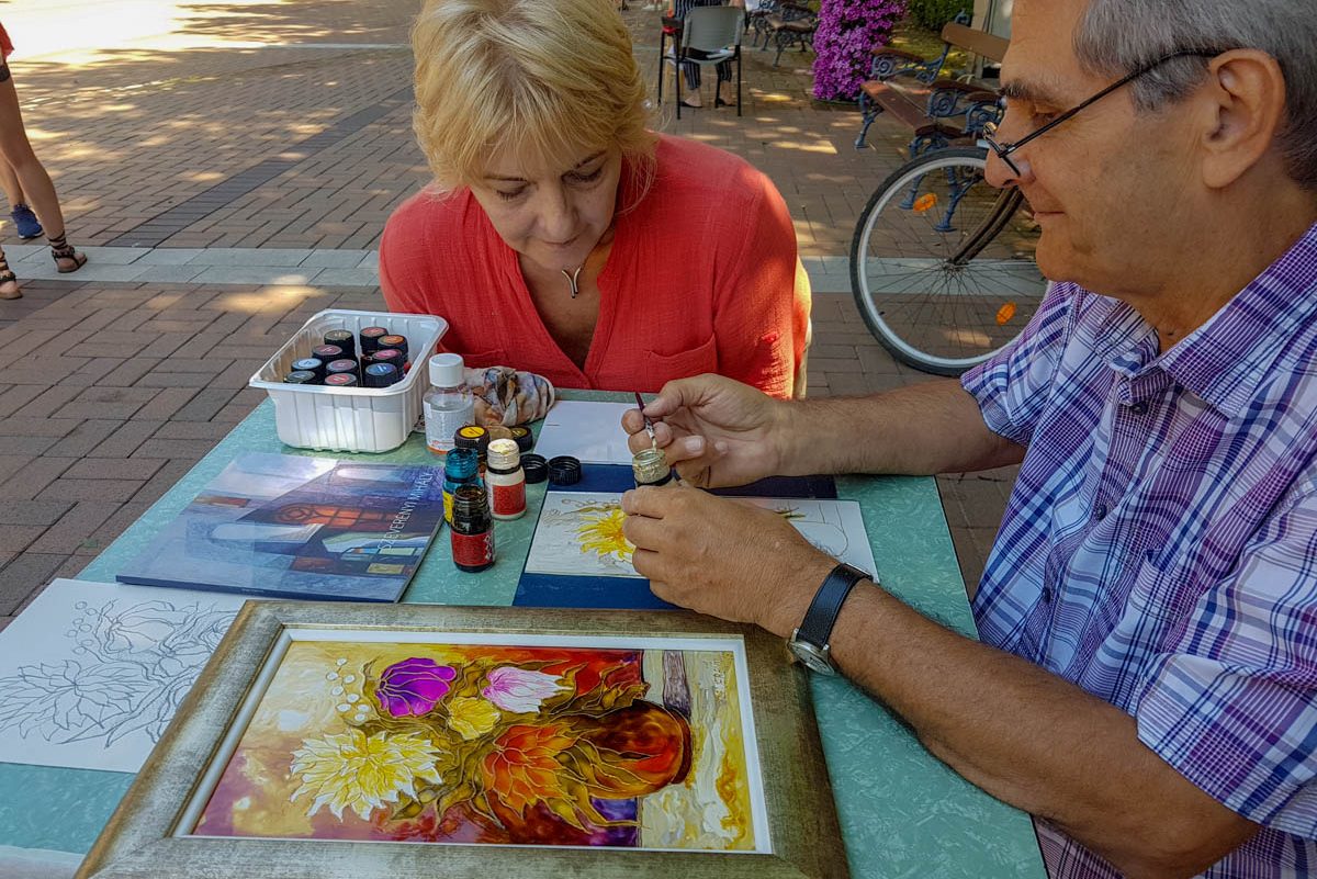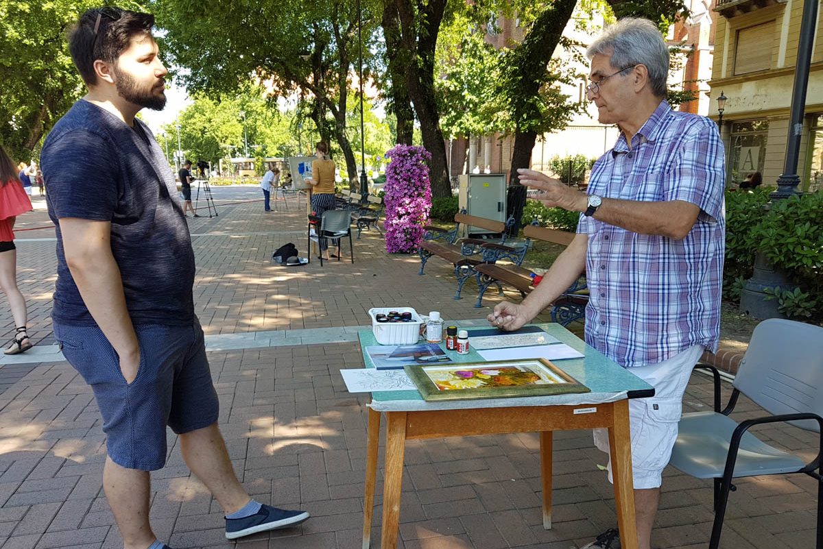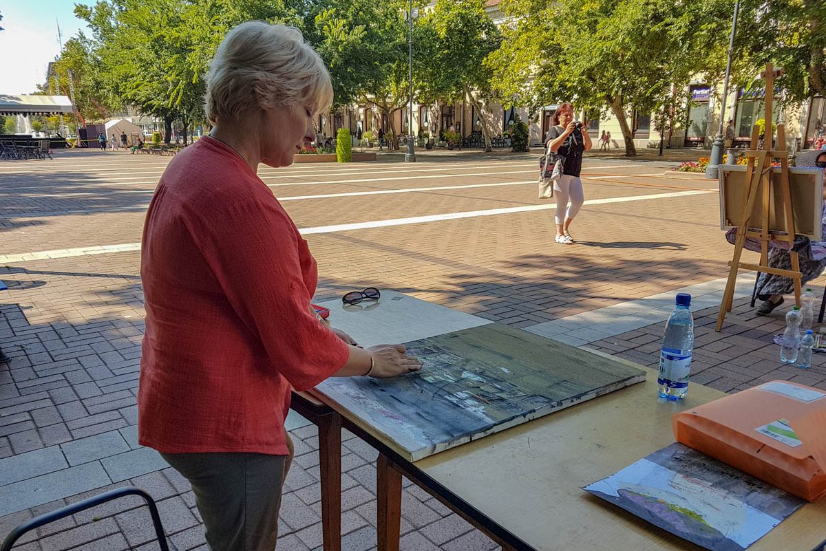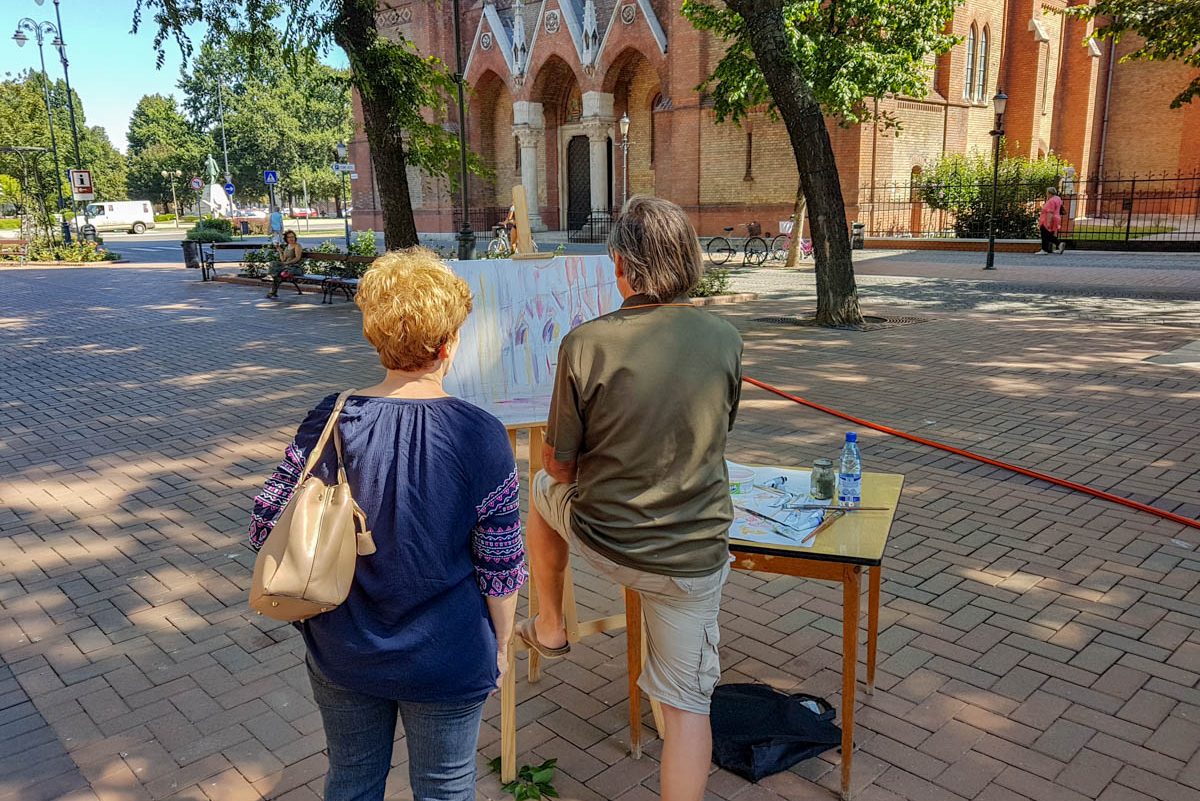Már évek óta része a művésztelep programjának, hogy szerda délelőtt a Békéscsabára érkezett művészek néhány órát a főtéren alkotva töltenek – kezdte Lonovics László, a művésztelepet szervező Békéstáji Művészeti Társaság korábbi elnöke. Ilyenkor bemutatkoznak a lakosságnak, egy bemutató festés történik. De a friss élmények, a látottak a festőket új inspirációval is feltöltik. Természetesen nem kötelező a környezetből meríteniük. Többen a saját művészeti programjukat festik tovább, csak más helyzínen.