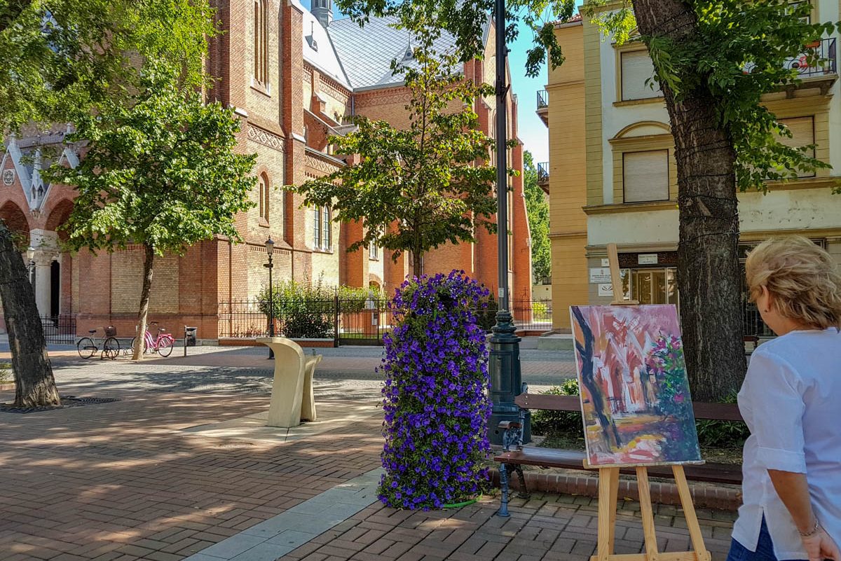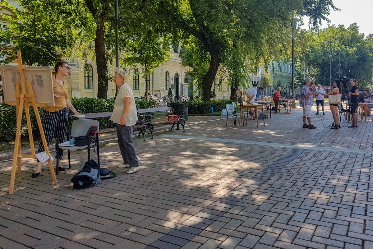 Festők a téren címmel szervezték meg ismét azt a különleges programot, amely során a Békéscsabai Nemzetközi Művésztelep alkotói kitelepültek a Városháza elé és az érdeklődő csabaiak szeme láttára, kérdései kereszttüzében vitték vászonra a környezet inspirálta képeket.