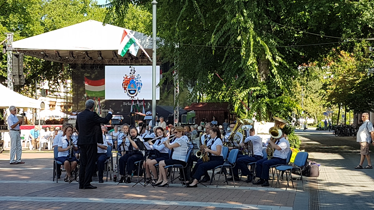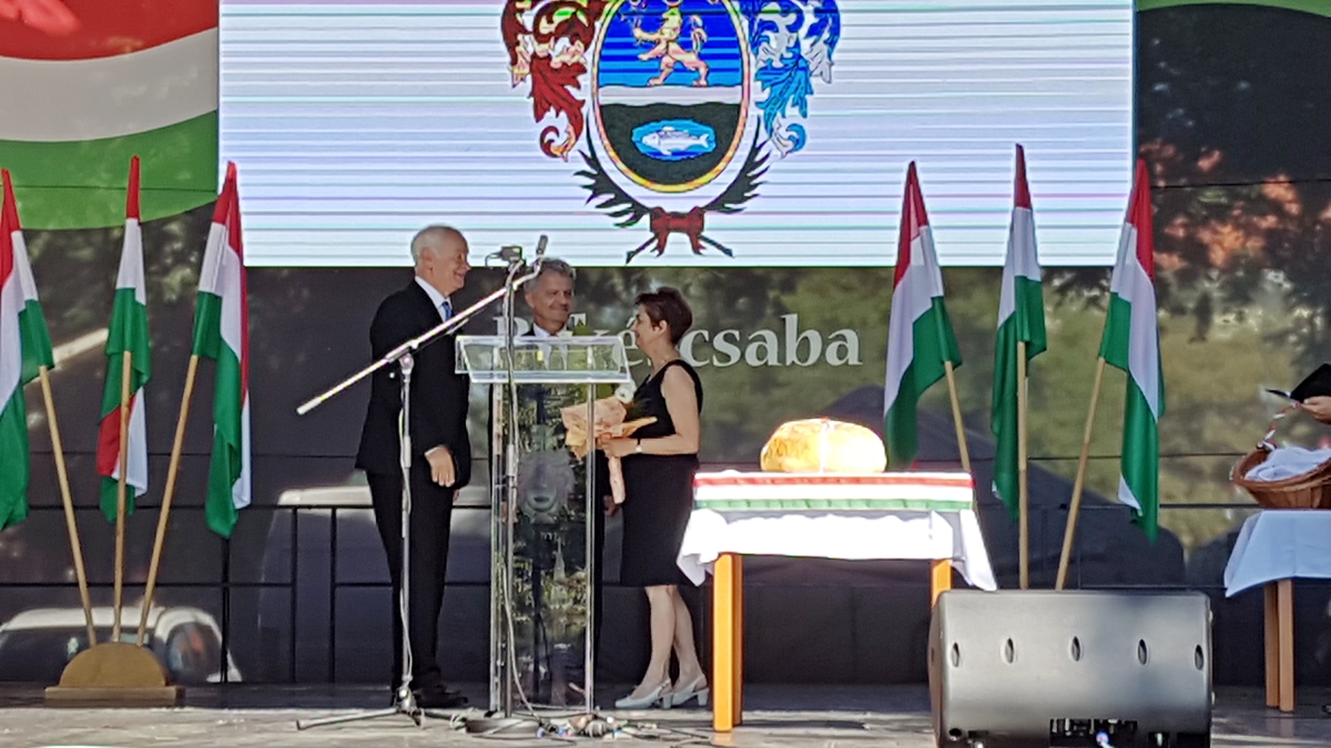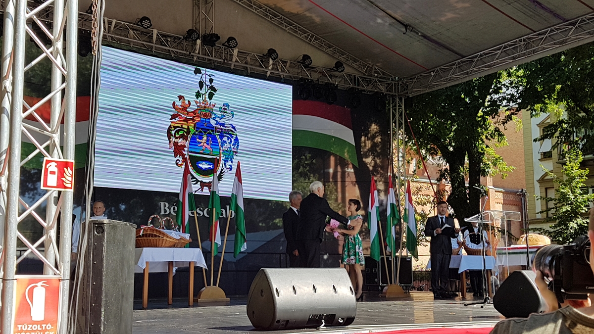 A délelőtt folyamán a Körösparti Vasutas Koncert Fúvószenekar térzenéje szórakoztatta elsőként az ünnepségre érkezőket. Ezt követte az ünnepélyes zászlófelvonás katonai tiszteletadással. Majd a főtér színpadán több kitüntetés alkalmából is gratulált az érintetteknek Szarvas Péter, Békéscsaba polgármestere és Herczeg Tamás, a térség országgyűlési képviselője. Rakonczás Szilvia, a Békés Megyei Könyvtár igazgatója Szinnyei József-díjat kapott, Paulikné Tóth Krisztina, a Csabagyöngye Kulturális Központ közművelődési főtanácsosa pedig Bessenyei György-díjban részesült. Az elismeréseket pénteken Budapesten, a Pesti Vigadó épületében adta át Rétvári Bence, az Emberi Erőforrások Minisztériumának parlamenti államtitkára Áder János köztársasági elnök megbízásából az augusztus 20-i ünnep alkalmából tartott díjátadón.