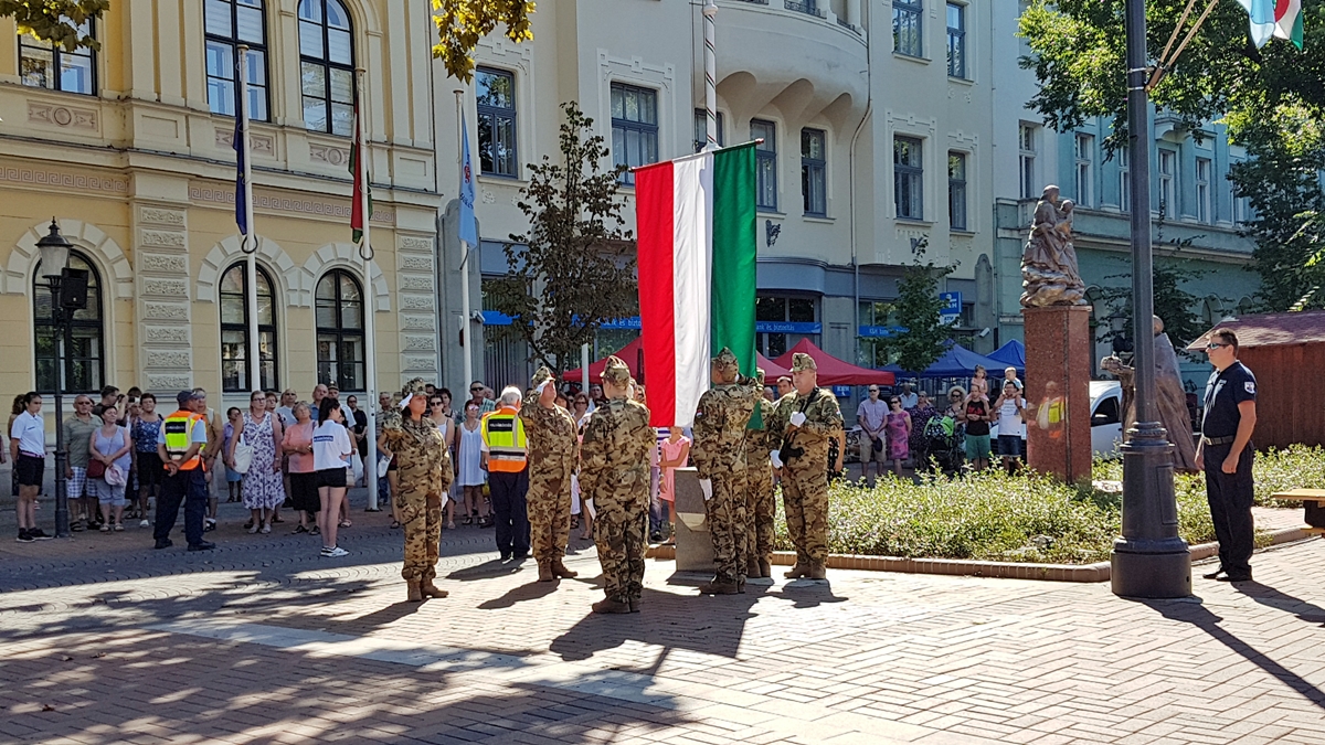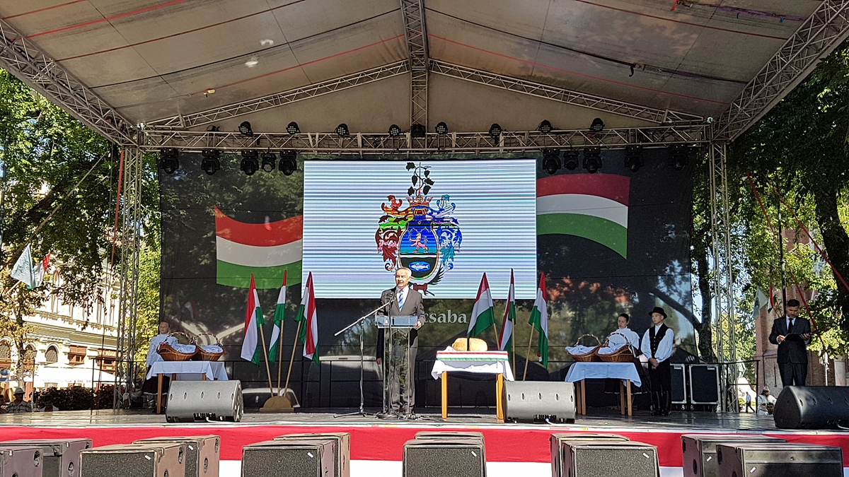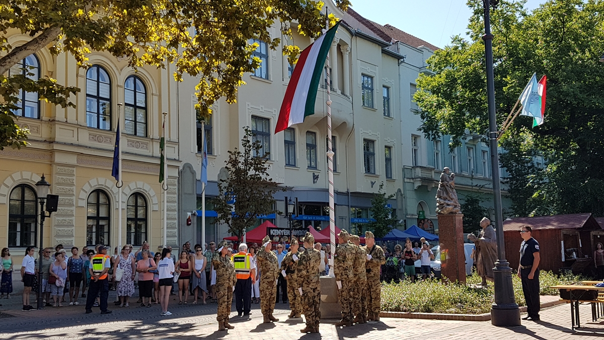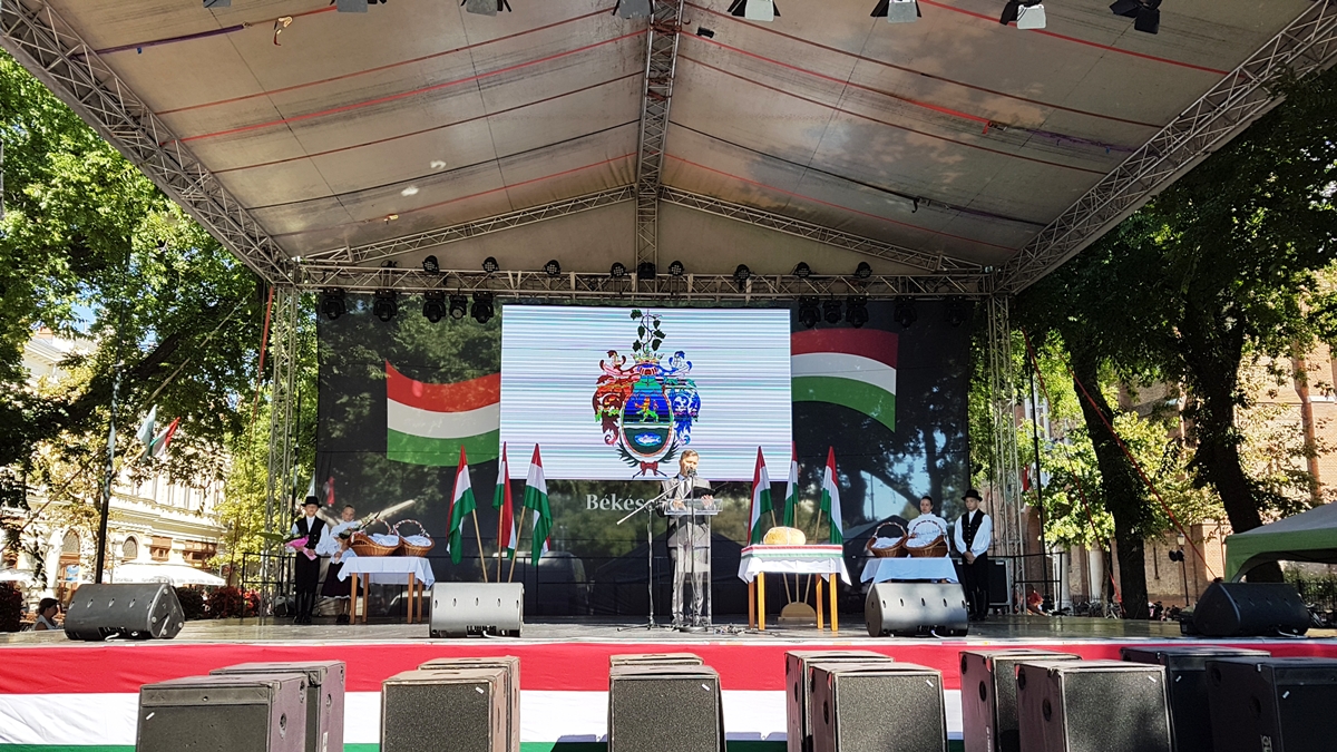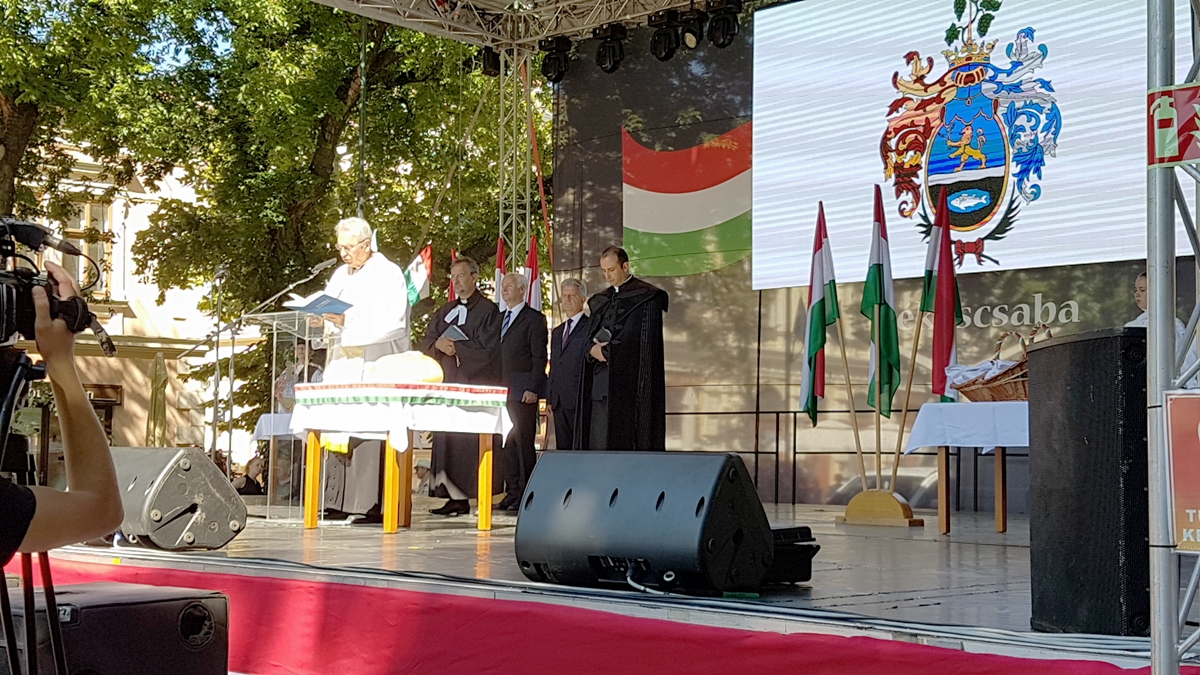 Békéscsabán, ahogy a megye számos településén, programsorozattal ünneplik augusztus 20-án az állam alapítását. A rendezvény zászlófelvonással kezdődött, majd kenyérszenteléssel, elismerések átadásával folytatódott.