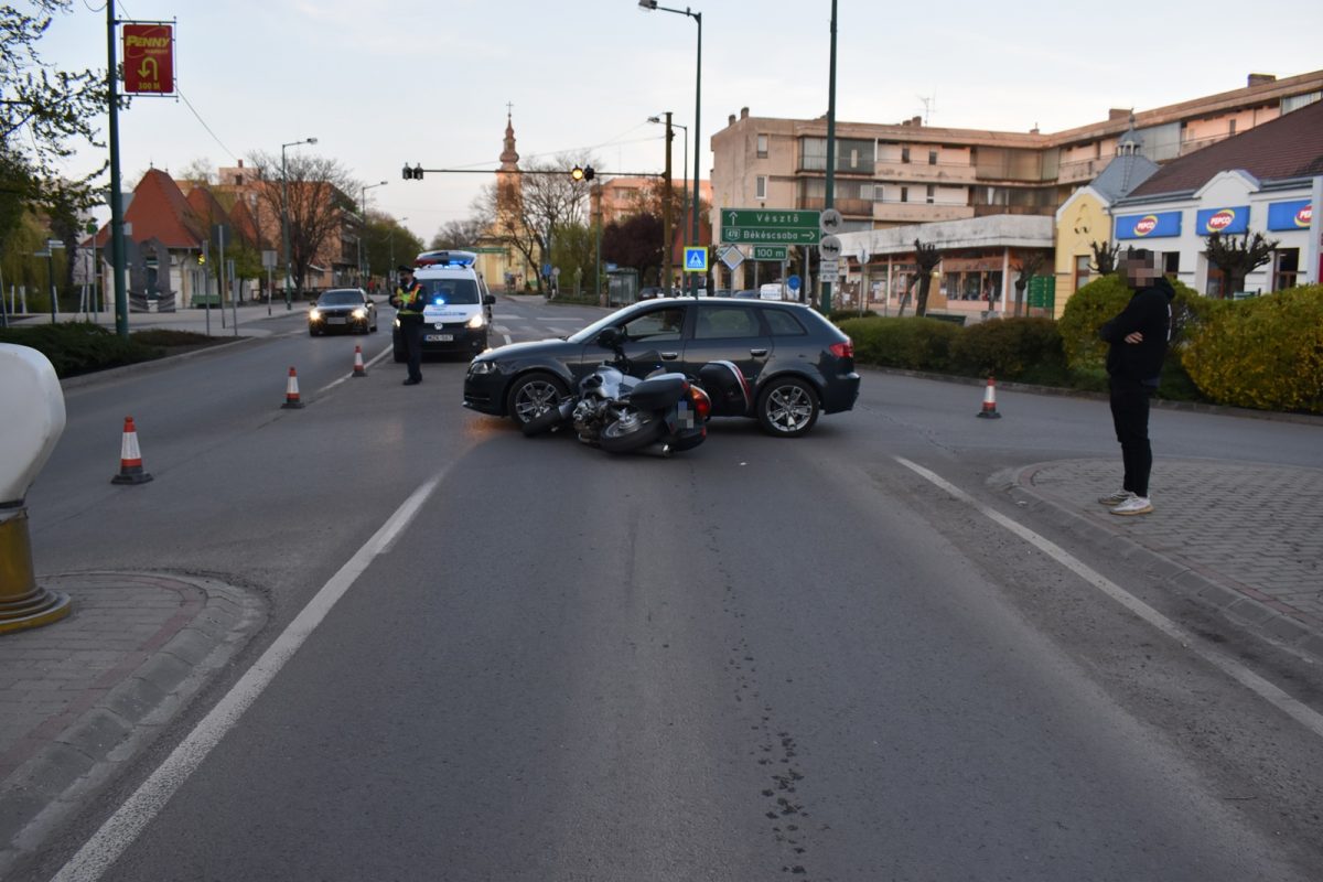 Békésen, a Szarvasi utca és a Kossuth Lajos utca találkozásánál 18 óra 15 perc körül egy személygépkocsival közlekedő férfi nem biztosított elsőbbséget egy motorkerékpárosnak és összeütköztek. A balesetben a motoros nyolc napon belül gyógyuló sérülést szenvedett – számolt be a Police.hu.