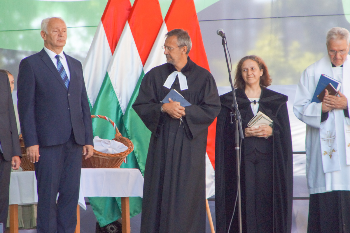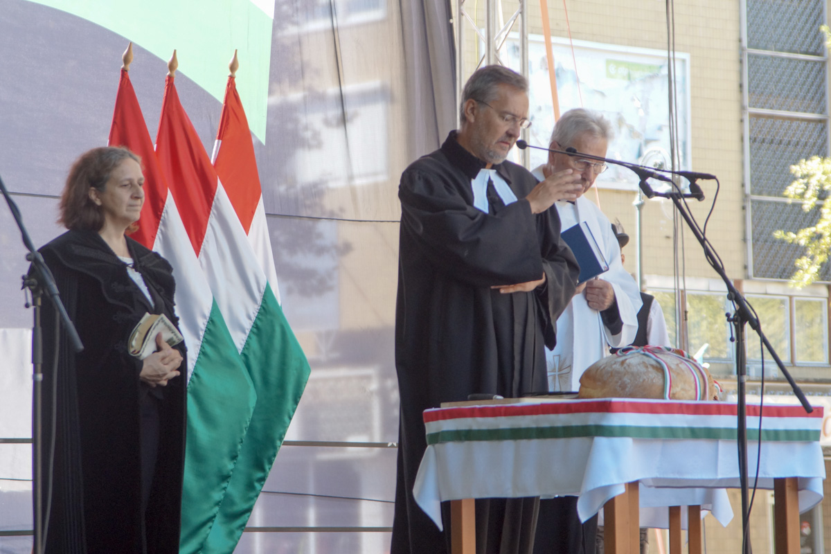 Az ünnepélyes zászlófelvonás után az ökumenikus kenyérszentelés következett a Szent István téren. A nemzeti színű szalaggal átkötött, új lisztből sütött kenyeret Szigeti Antal katolikus plébános szentelte meg, és Kutyej Pál evangélikus lelkész, valamint Kollárné Nagy Mónika református lelkipásztor áldották meg.