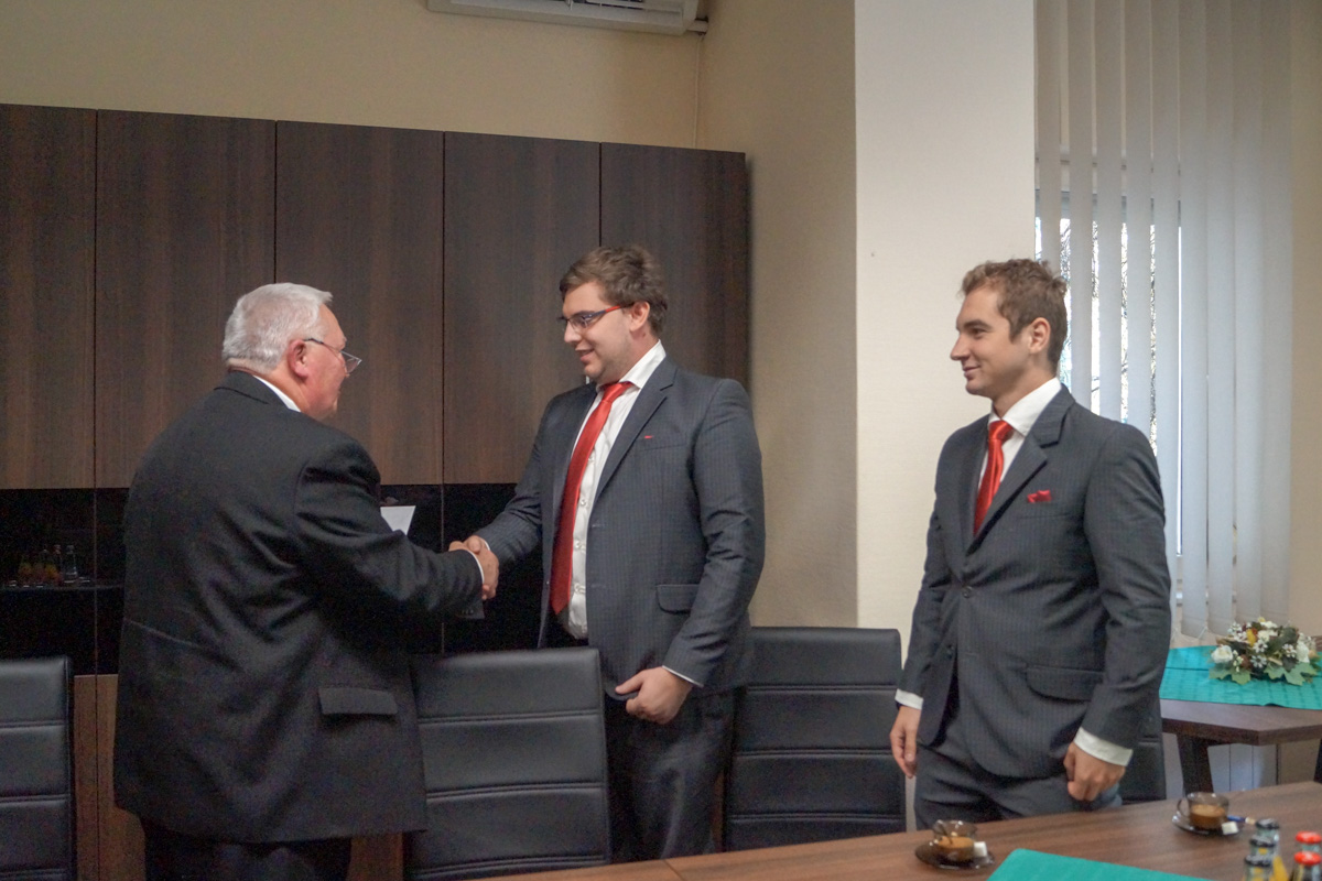 Dr. Orosz Tivadar, a Békés Megyei Kereskedelmi és Iparkamara elnöke köszöntötte és jutalmazta meg a napokban az idei EuroSkills verseny két eredményes megyei résztvevőjét, Bakonyi Dávidot és Takács Zoltánt.