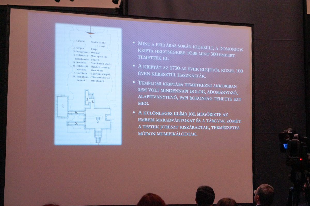 Szűcsné Zomborka Márta vázolta fel, hogy annak idején, 1994-ben hogyan is találták meg a múmiák kriptáját, majd hogyan, hová kerültek a múmiák. Elárulta, nagyon ritka, hogy ennyire pontos adatokkal rendelkeznek, ennyire kutathatóak a maradványok. Ez is hozzájárul a leletegyüttes egyediségéhez. Hiszen például az akkor élt váciak néhány leszármazottjával a kapcsolatot is fel tudták venni.
