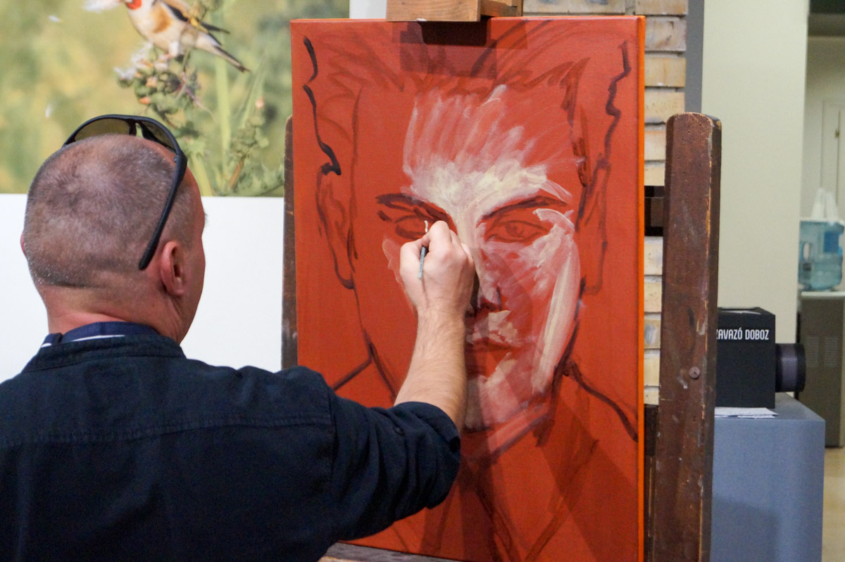 A tárlatvezetést követően – a Munkácsy Mihály Múzeum történetében először – élőfestészeti bemutatón vehetett részt a közönség. A művész egy családi portrét festett meg, az egyik nagyapja fiatalkori fotója alapján. Az élő festés nehezített műfaj, hiszen kizárja a megszokott műtermi intimitást, ahol a művész és a kép interakciójába nem lesnek bele kíváncsi tekintetek. De pont ezért is különleges, bepillantást nyújt a vászon életre kelésébe, a misztikus folyamatba, hogy lesz a vonalakból arc, a festékből bőr.
