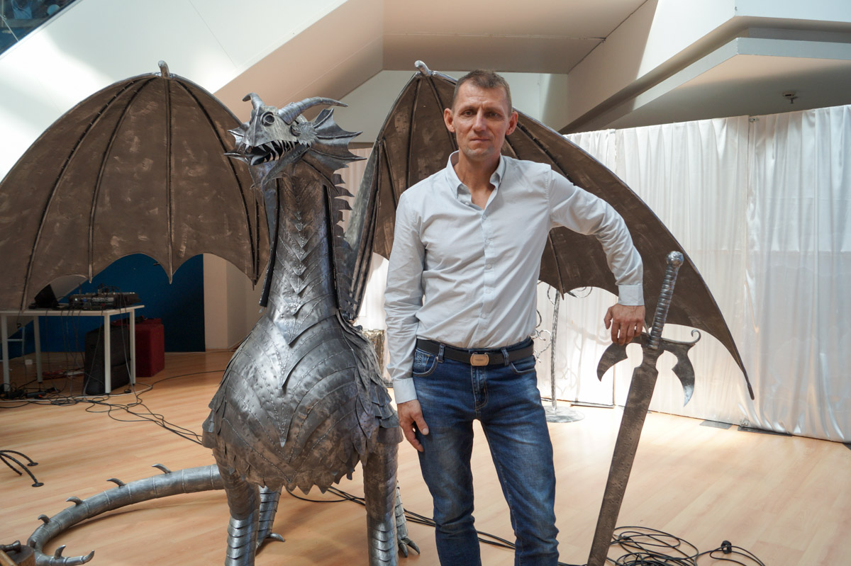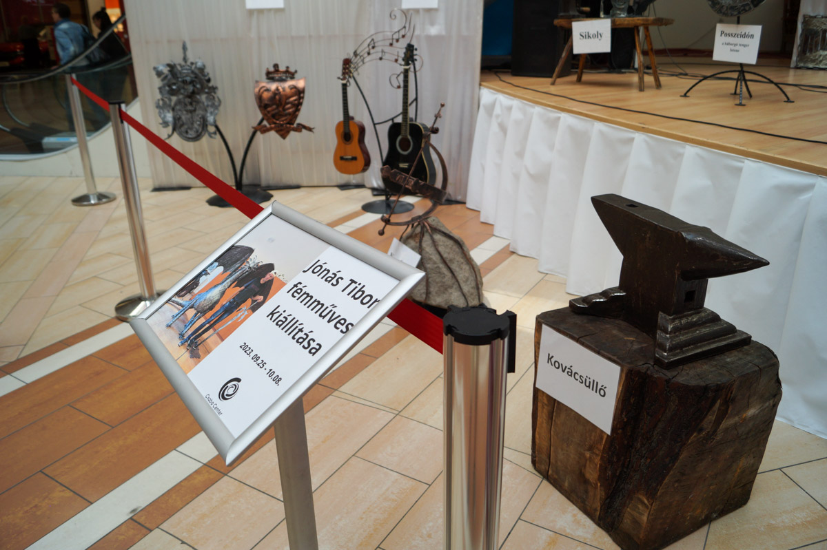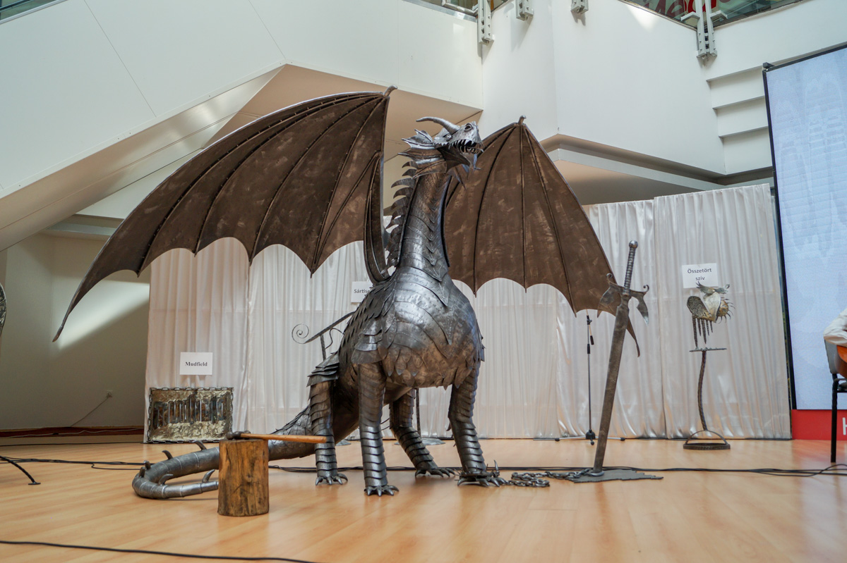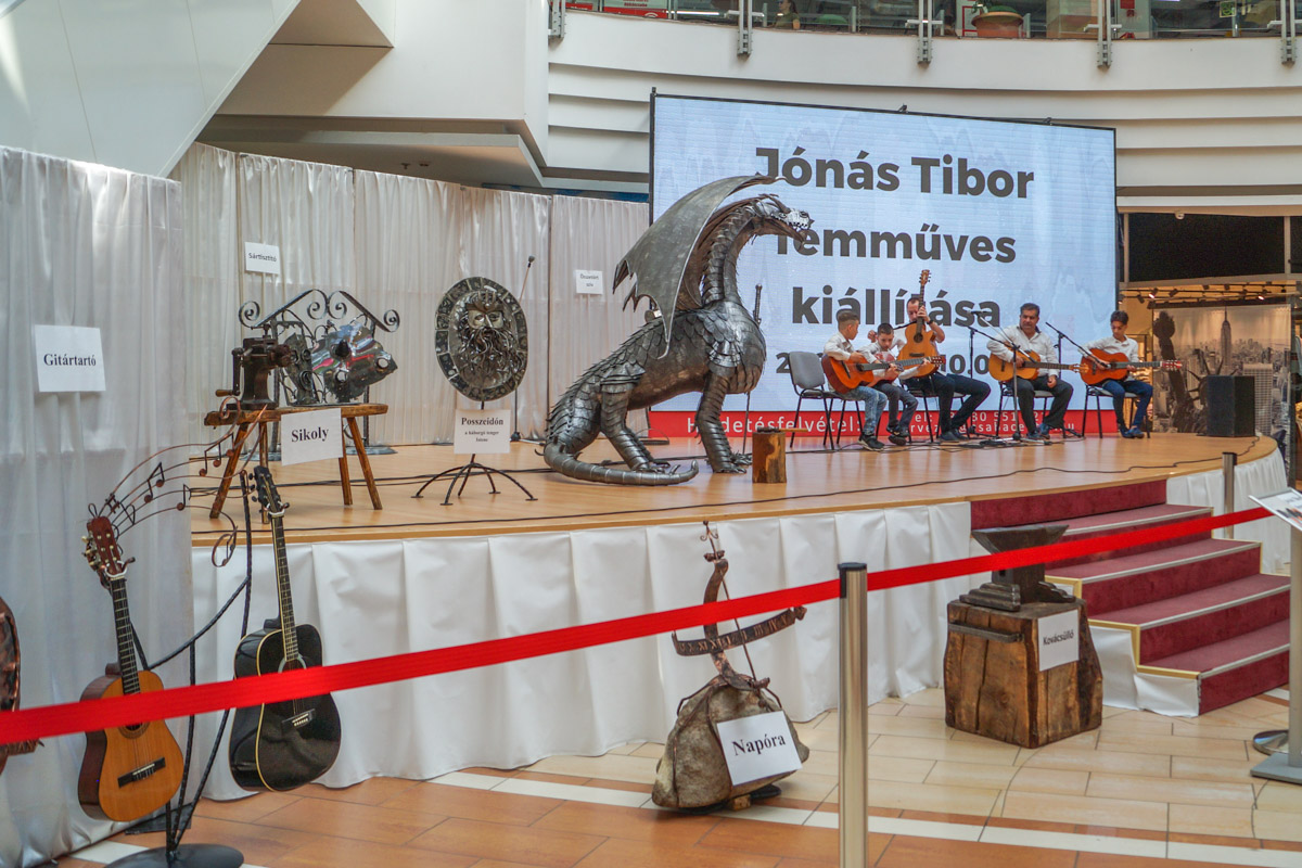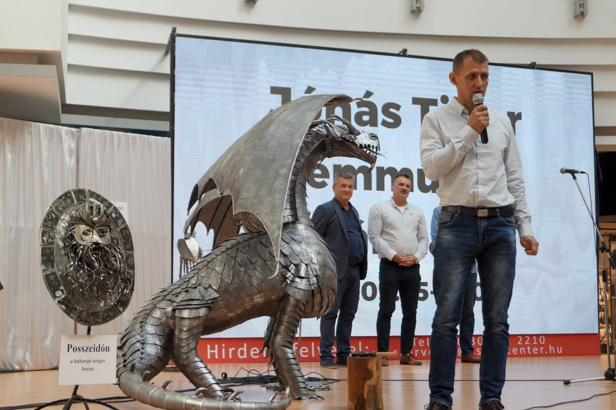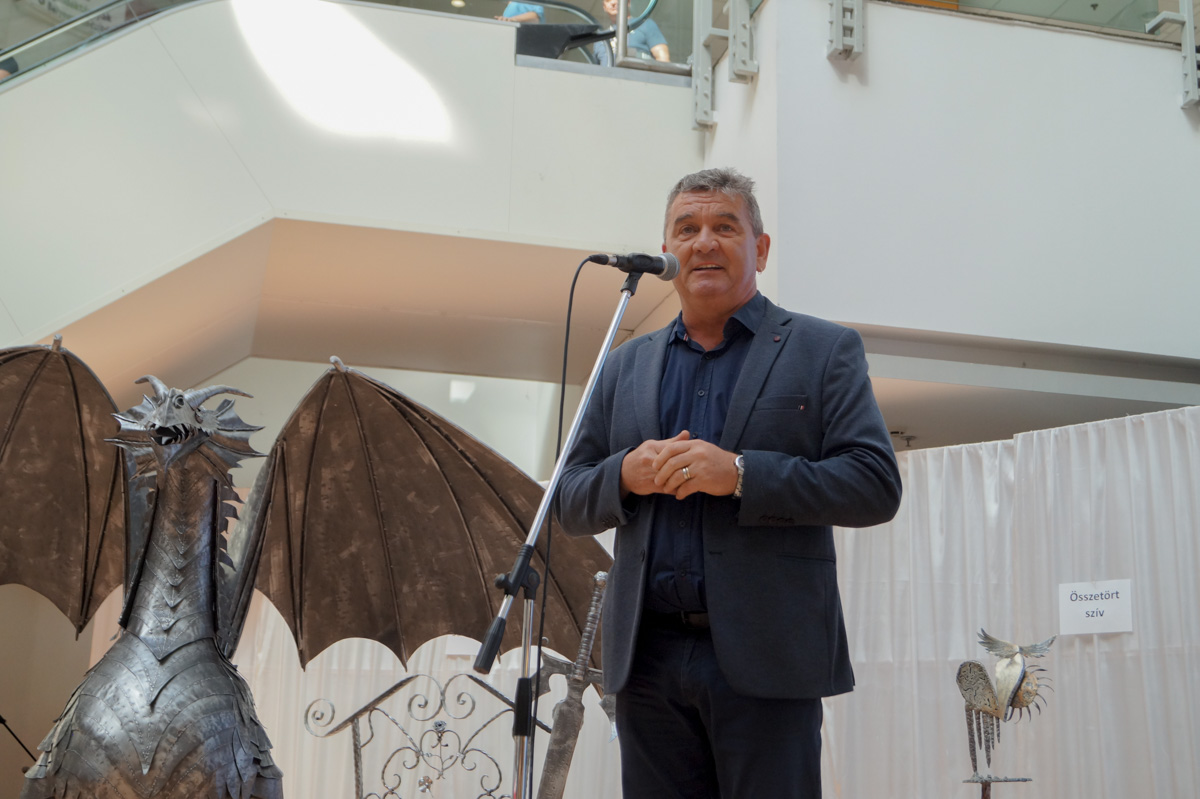 Hrabovszki György köszöntőjében kitért arra, hogy a központ megnyitása óta igyekszik többet adni az üzletek kínálatánál. Fontos küldetése a tehetségek felkarolása. Ez a kiállítás a szerencsés véletlenek folytán jött létre, hiszen Jónás Tibor alig néhány hete kereste fel azzal az ötlettel, hogy a fém sárkányát szeretné az épületben bemutatni. Ezzel is arra buzdít minden érdeklődőt, hogy keressék bátran, ha hasonló ötletük, tehetségük van.