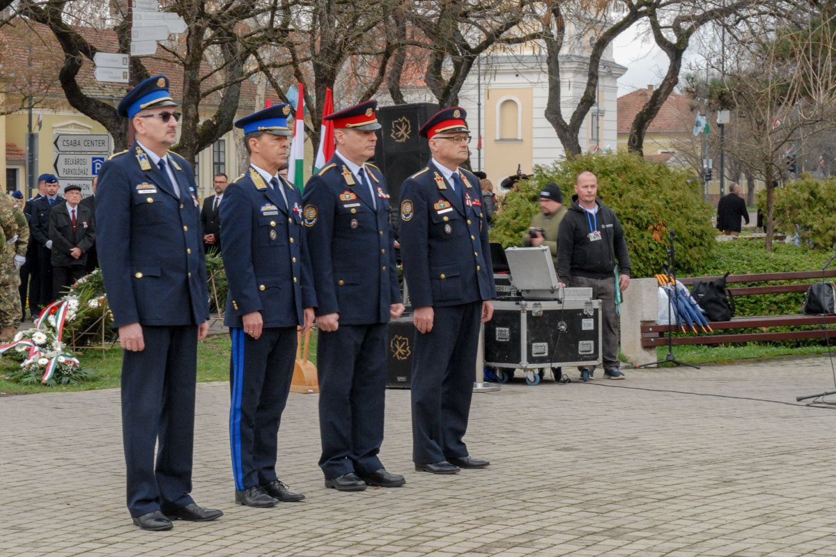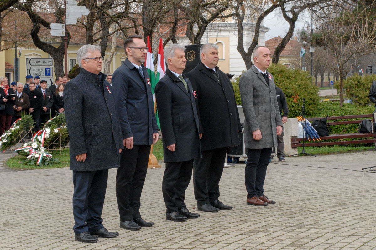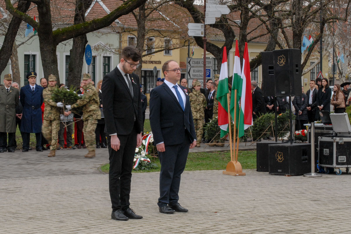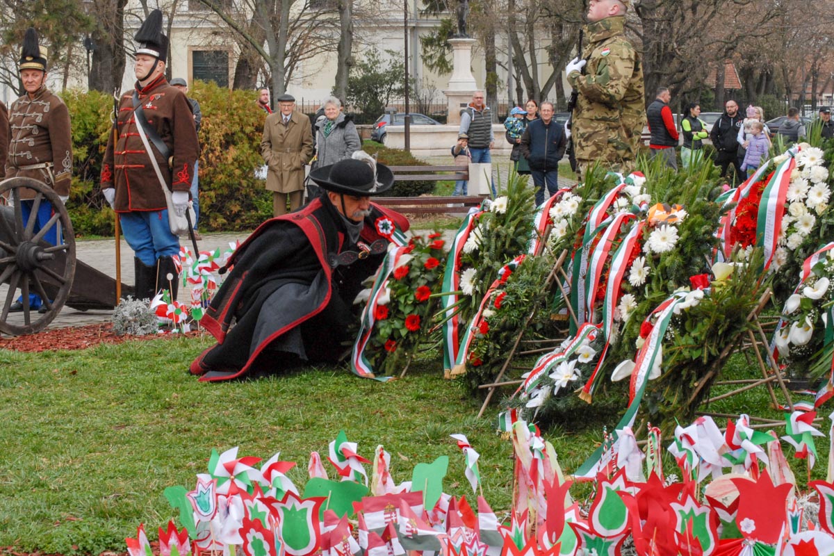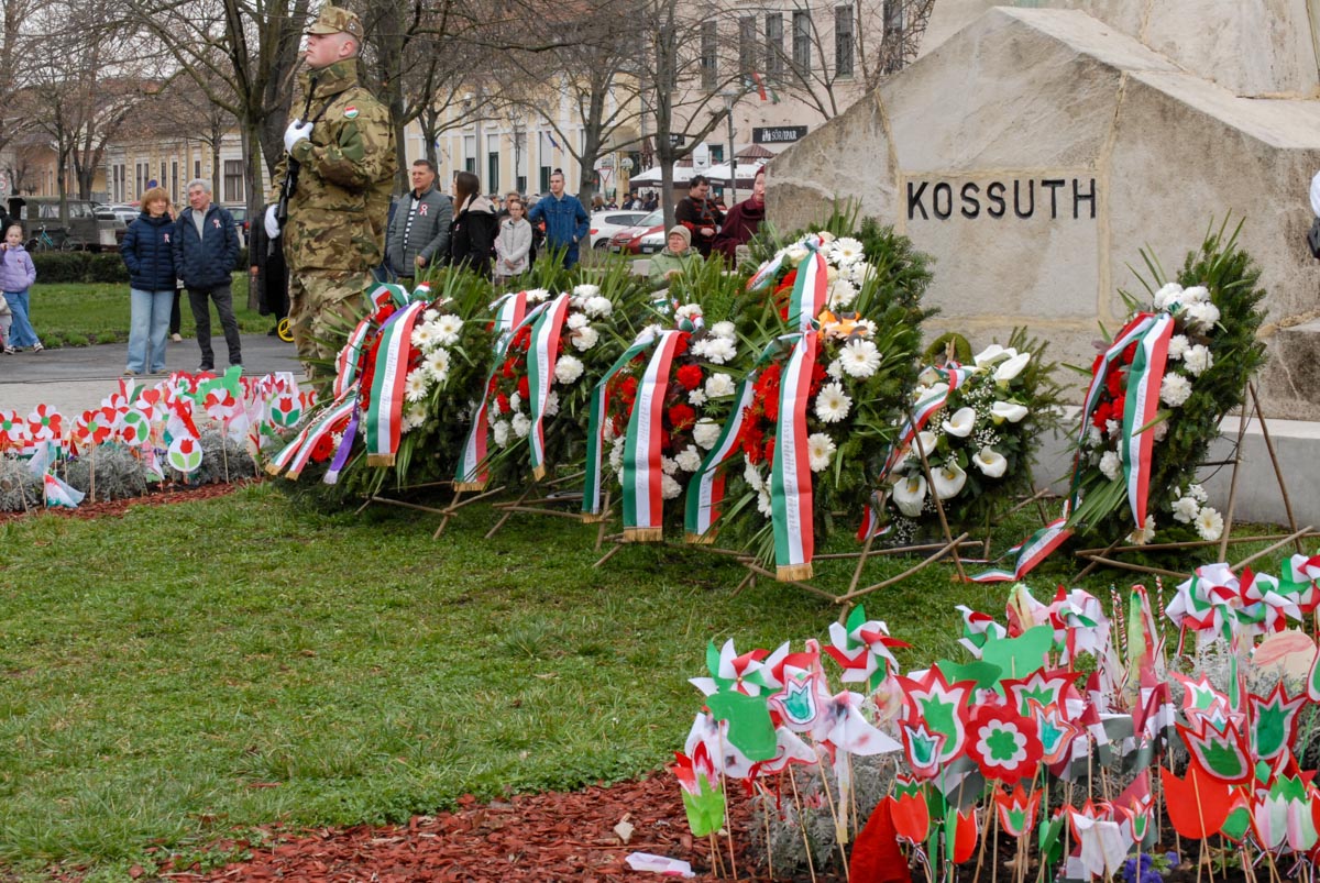Az 1848/49-es forradalom és szabadságharc hőseire emlékeztek március 15-én Békéscsabán is. Bár az esős időjárás miatt a programokat áthelyezték a Csabagyöngyébe, a megemlékező koszorúkat elhelyezték a 120 évvel ezelőtt felállított Kossuth szobornál. Koszorúztak az önkormányzat, a rendvédelmi szervek, a nemzetiségi önkormányzatok, az oktatási intézmények és a pártok képviselői, Herczeg Tamás országgyűlési képviselő, valamint civil szervezetek képviselői.
