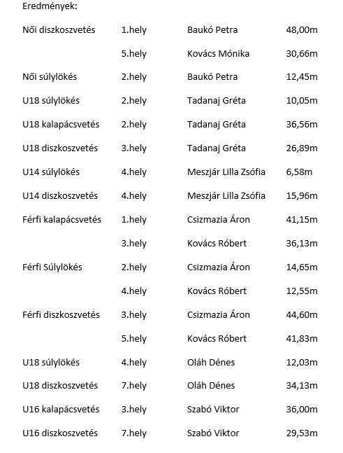 Lángok martalékává vált egy tanyaépület MagyarbánhegyesenA fiatal versenyzők is kitettek magukért. Az U18-as korosztályban Tadanaj Gréta mindhárom versenyszámban dobogóra állhatott: súlylökésben és kalapácsvetésben ezüst-, diszkoszvetésben bronzérmet nyert. Az U16-os korosztályban Szabó Viktor kalapácsvetésben végzett a legelőkelőbb helyen, ahol harmadik lett.