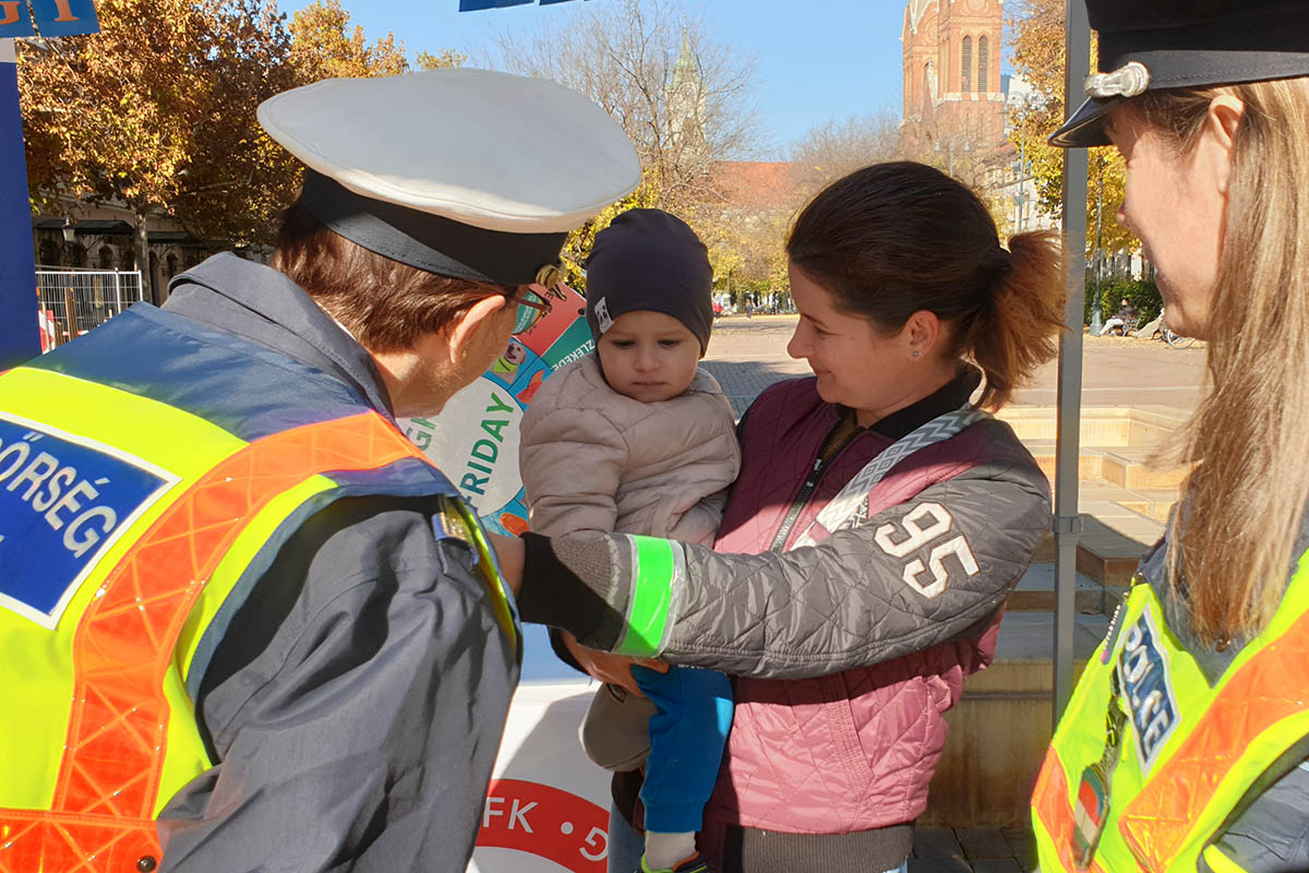 Nem mindennapi akcióval hívták fel a figyelmet a biztonságos közlekedésre pénteken Békéscsabán. A városközpontban a Békés Vármegyei Rendőr-főkapitányság is csatlakozott az országos Light Friday programhoz, ahol százszázalékos leértékelést hirdettek: a résztvevők teljesen ingyen juthattak láthatóságot segítő eszközökhöz.