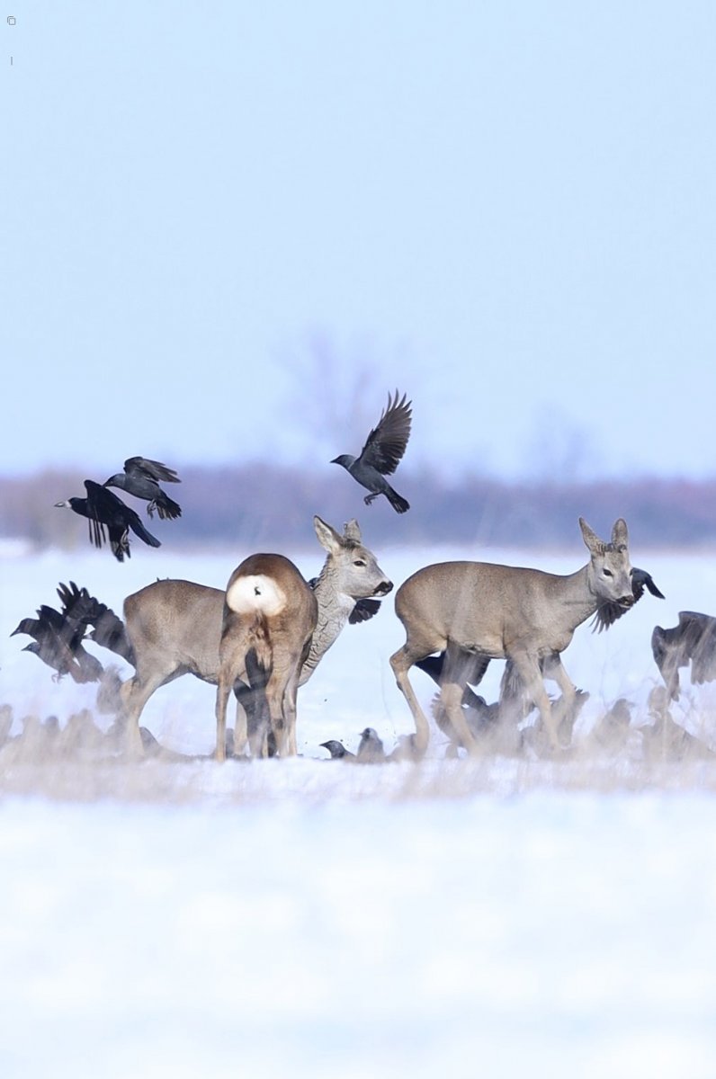 A behavazott, fehér tájban már messziről feltűnhet egy-egy népes őzcsapat. Ha ilyet látunk, érdemes távcső segítségével tüzetesebben megfigyelni őket. Már maga a hóelkaparó tevékenység is nagyon látványos, csak úgy porzik a hó a patájuk alatt. Ha alaposabban szemügyre vesszük az őzcsapatokat, megfigyelhetjük a körülöttük szorgoskodó, táplálék után kutató madarakat is – írja holnapján a Körös-Maros Nemzeti Park.