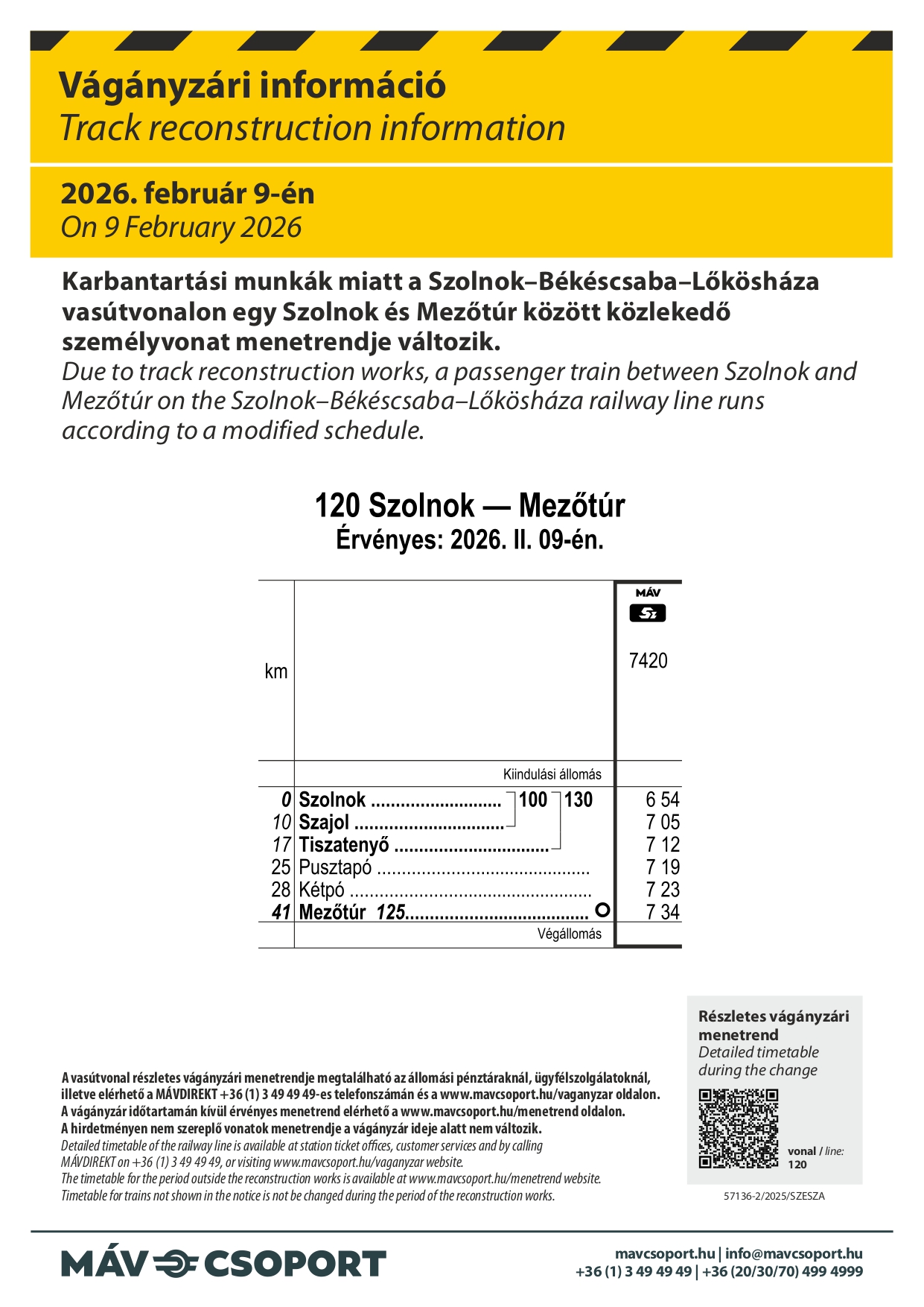 Karbantartási munkák miatt a Szolnok–Békéscsaba–Lőkösháza vasútvonalon egy Szolnok és Mezőtúr között közlekedő személyvonat menetrendje változik – közölte a MÁV.