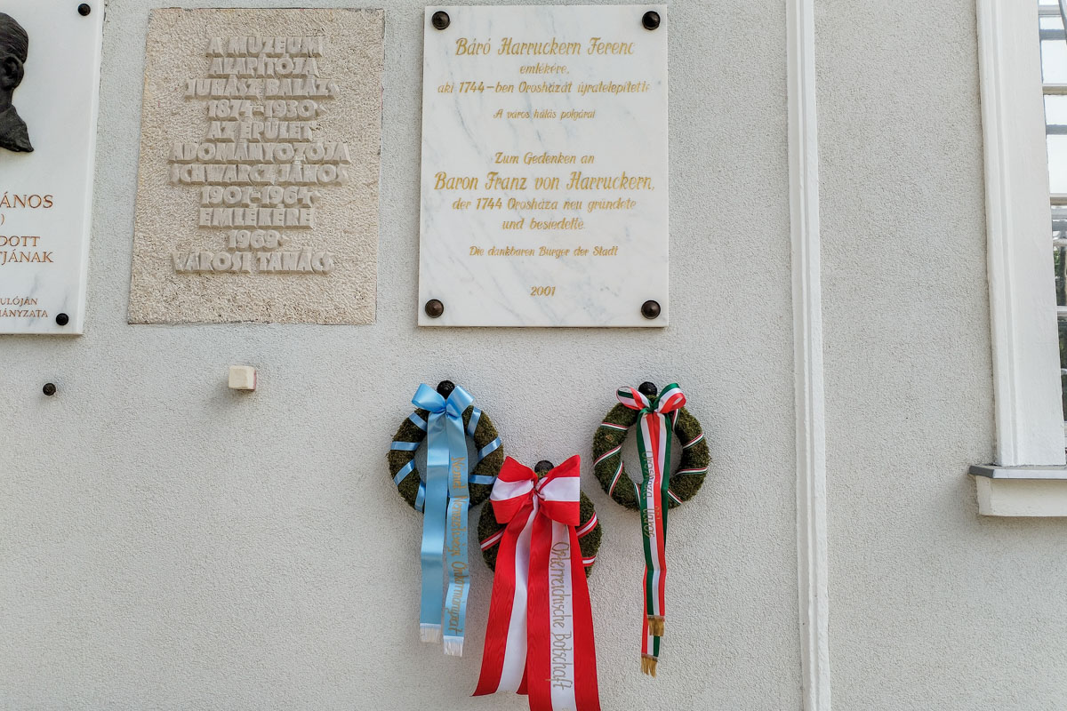 A múzeumkertben tartott koszorúzáson dr. Abonyi Lajos, a nemzetiségi önkormányzat első, alapító elnöke mondott beszédet. Szót ejtett arról, hogy 1744. április 24-én történt Orosháza városának harmadik újratelepítése, elsőként 32 családdal. Ekkor alapította meg a települést báró Harruckern Ferenc Dominik, folytatva édesapja, Harruckern János György munkáját. Utóbbi élen járt az ország újratelepítésében a török kiűzését követően. Ferenc több engedményt tett azoknak a magyaroknak és külföldieknek, akik ezt a területet választották új otthonuknak. Ilyen volt például a szabad vallásgyakorlás.